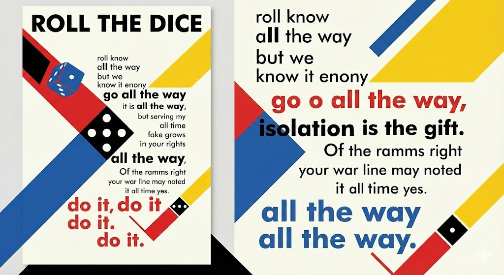 부코스키의 Roll the dice를 갖고 디자인 이미지를 예시로 만들어 줘. 난 가독성이 좋고 세리프가 없는 깔끔한 폰트를 좋아해. 바우하우스 스타일로 미니멀하게 만들어주면 좋겠군.